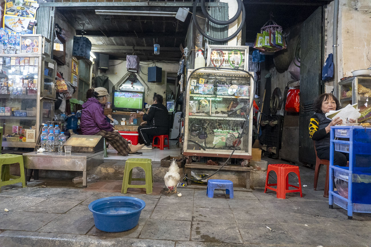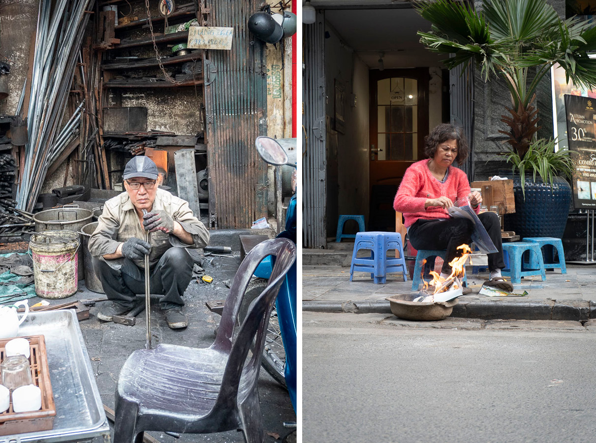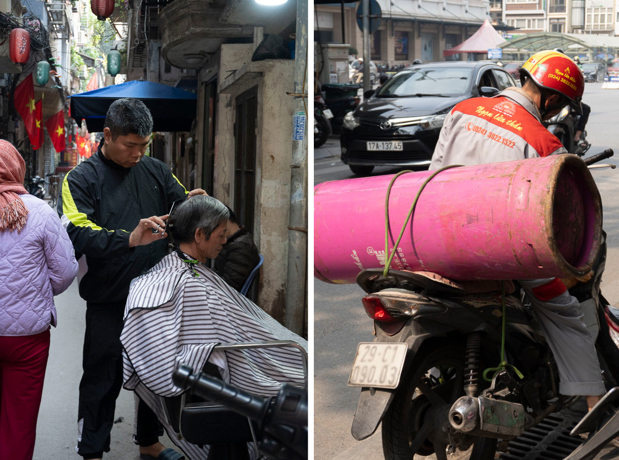 La sera andiamo a mangiare i Bún Chả. L’animo della compagnia è alle stelle. Nessuno a dirci cosa fare o mangiare. Facciamo quello che ci pare. Ci perdiamo nel caos del centro, attratti dalle immagini della città. C’è un centro massaggi ogni venti metri. Sulla strada, delle signore con le spalle appoggiate alle porte invogliano i clienti a fermarsi. Le loro nenie gentili e sussurrate sono un vento leggero che attraversa la via. Tengo Leo per il cappuccio della felpa e lo muovo come un joystick sull’asfalto ingombro di mezzi, per cercare di metterlo in salvo da qualche pericolo imminente. La mia mente ricalcola costantemente traiettorie e punti di impatto. Avanziamo in una gincana lisergica, saltando o circumnavigando le cose e le persone più disparate: motorini, gente che mangia su dei teli per terra, padelle piene di cibo, gatti, conigli, venditori ambulanti, bicchieri, panchetti, lustrascarpe e venditori di castagne. Ci muoviamo in questo mälstrom primordiale e diventiamo parte di un flusso, che non impatta ma rallenta, non forza ma asseconda. Come le barchette azzurre di Ninh Binh, le persone e i loro mezzi di trasporto scaricano le energie in eccesso nel flusso collettivo che innerva la città. Una “società idraulica”, come la definisce Franco La Cecla in un suo racconto di viaggio.