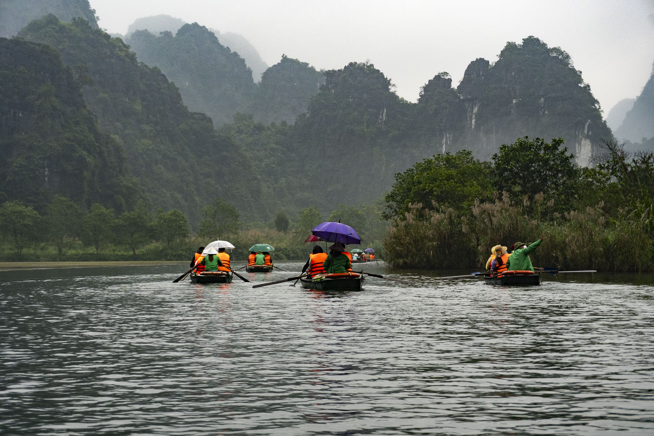 Il fiume si allarga e si stringe, piega bruscamente, poi oscilla e si distende. L’acqua riflette il verde degli alberi, la bruma umida e appiccicosa si posa sull’obiettivo della macchina fotografica. Insieme a noi, sul grande fiume, altre centinaia di barchette vanno e vengono, ci sfiorano ma non ci impattano, ci salutano ma col silenzio di un sorriso o un gesto di una mano. Entriamo dentro una grande grotta. Il rumore dell’acqua rimbomba sulle pareti di pietra. Dobbiamo abbassarci per non battere la testa sul soffitto. Riemergiamo alla luce. Falesie di roccia si impennano sull’acqua. È tutto talmente verde che mi sento verde anche io. Sullo sfondo compare un tempio arroccato su un isolotto in mezzo al fiume. La nostra gondoliera si fa largo a pagaiate e ci scarica, indicandoci il numero della barca con la mano. Gironzoliamo per il tempio, adocchiamo gli enormi Buddha, i banchi con le offerte e gli incensi. L’oro degli arredi scintilla a contrasto con il verde tutto intorno. Faccio qualche passo svogliato, stando attento a non finire nell’inquadratura di qualche telefonino. Comincio a sentire freddo. Risaliamo in barca. Ancora grotte, ancora templi, ancora acqua. Faccio a gara con Leo a chi trova il numero più alto scritto sulle barchette. Vince lui con 1934. Dei grandi uccelli, sottili e affusolati, planano fra le falesie erose dal fiume; una scimmia si muove fra un groviglio di banani. Stretto nel giubbotto di salvataggio, mi perdo nella contemplazione dello spazio intorno; mi sento coincidere, sono una pianta anche io. Abbranco il corpicino di Leo con le mie radici. Mentre ci prepariamo a scendere, un nugolo di carpe grosse come tonni boccheggia in superficie, lottando per accaparrarsi una briciola di cibo dispensata dalle mani di alcuni bambini. La scena mi disgusta e mi lascia un senso di nausea. Leo invece è folgorato da quello spettacolo di corpi idrodinamici e mi inchioda a bordo lago. Guardo i gondolieri vietnamiti incunearsi fra le barche ormeggiate lungo il fiume. Le barchine cozzano fra loro. È un’energia tranquilla, fa oscillare gli scafi e le persone ma con grazia, disperdendo l’energia in eccesso nell’acqua del fiume.