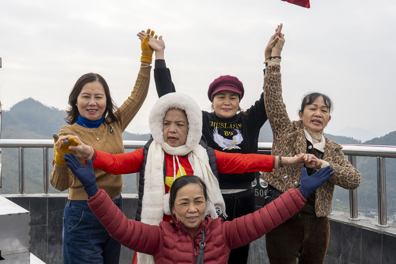 Andiamo a visitare la torre della bandiera di Lung Cù nell’estremo nord del Paese. Per arrivarci hanno fatto una scalinata di 400 gradini, ma a noi ce ne fanno fare solo 100. È un pisellone di mattoni di una quindicina di metri. In cima hanno piantato una colossale bandiera del Vietnam che sventola impazzita ad intimidire il territorio cinese. Mi arrampico con Iris in cima ad una lunghissima scala a chiocciola. Quando arriviamo in cima alla torre troviamo un gruppo di signore che si sparano pose di gruppo davanti ad un telefonino;