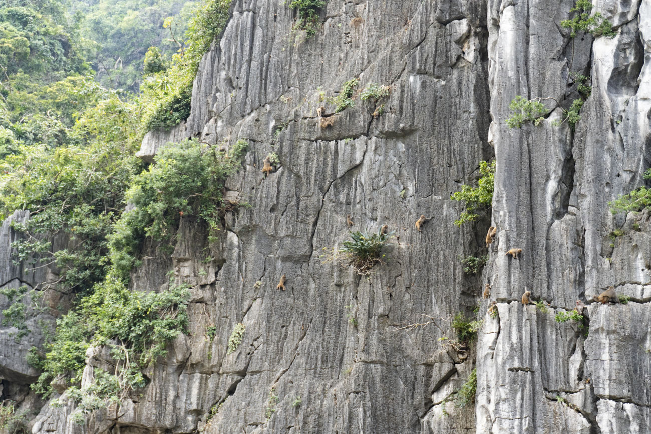 Sbarchiamo su un molo affogato di imbarcazioni e persone. Tom Cruise ci guida come una mandria di vacche verso il successivo gommone. Facciamo la fila, poi saliamo con i nostri ingombranti giacchetti su un barchino a remi. La grotta è a poche centinaia di metri. Il rombo dei motori e il cozzare degli scafi sommerge il chiacchiericcio scomposto di noialtri turisti. Il pagaiatore si spertica per conquistare un varco dentro la grotta. È tutto un cozzare di scafi e sciacquettio di remi. Leo vede un serpente d’acqua lanciarsi nel marasma. Quando riusciamo ad uscire da quel carnaio, la vista si apre su una baia nascosta, sormontata da pareti di roccia immense, dove alberi e piante si sono ritagliate un triangolo di terra e di sole per sopravvivere. Sulla parete a sud un gruppo di scimmie, forse trenta, forse di più, si muove agile tra le rocce a picco, avvinghiandosi ai rami delle piante che crescono a strapiombo sul mare. Sono bellissime. Si muovono compatte, si chiamano, si afferrano e si spingono. Una lotta collettiva contro la gravità.