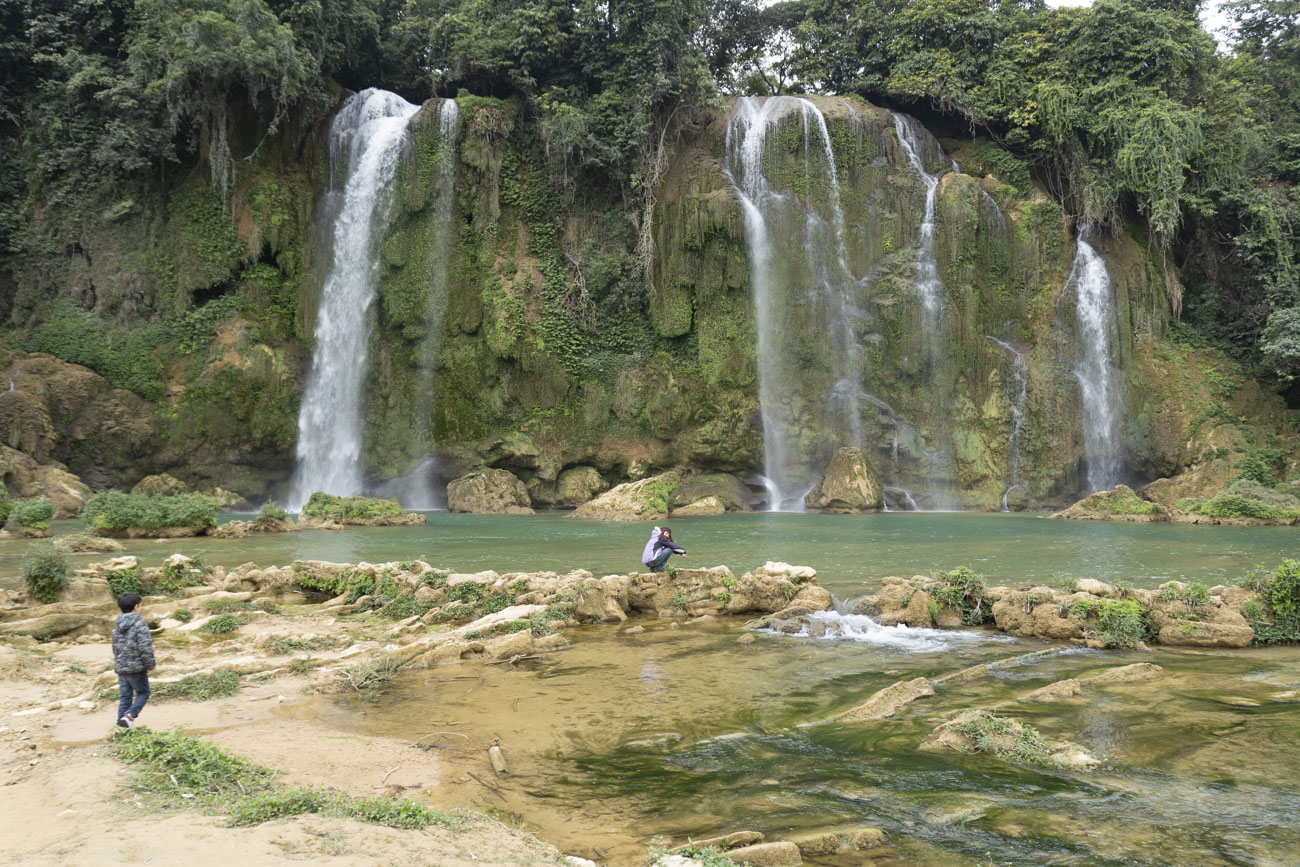 Prima di pranzo andiamo a vedere un villaggio fatto di campi di riso, casine di pietra e cantieri edili. Ci fermiamo a prendere un caffè da una signora che ci fa vedere la sua casa. Le stanze sono spoglie e male in arnese. Ci sono oggetti di vita quotidiana sparsi sui divani e le sedie, un po’ di casino in cucina, bambini piccoli che ronzano sui pavimenti di terra battuta. Il mood che si respira mi ricorda casa. Dopo pranzo andiamo a vedere le famose cascate di Ban Gioc. Ci caricano su un battello e ci portano sotto le cascate. Facciamo una trafila di foto. Iris esige un servizio fotografico completo da poter poi pubblicare sui suoi social network. Dopo ogni scatto lei si tocca convulsamente la sua massa di capelli rossi, assumendo posizioni sempre più improbabili e poi lamentandosi delle espressioni che assume la mia faccia semi nascosta dalla macchina fotografica. Le cascate sono al confine con la Cina e dall’altra sponda del fiume un esercito di battelli cinesi mette a profitto quella risorsa turistica condivisa.
