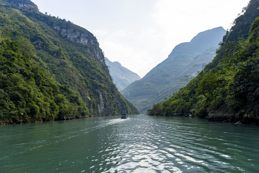 L’acqua ha il colore del corallo e viene voglia di tuffarcisi dentro. Il fiume procede lentamente facendo gincana fra le pareti di roccia. La barca si ferma. La corrente ci spinge verso l’orizzonte che compare timido fra le montagne. Stiamo sospesi così per qualche minuto, poi facciamo inversione e torniamo verso il molo.